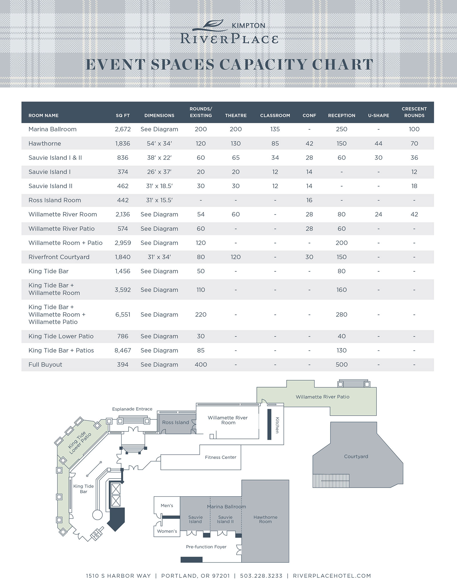 We know that variety is spice of life, so we like to give you options aplenty. Depending on the size of the get-together you’re hosting and the vibe you seek, choose between spaces like the Marina Ballroom (2,672 square feet) and Ballroom Foyer (perfect for a reception of up to 150 guests). Also consider enticing options like a restaurant buyout, one of our smaller spaces, or even our riverfront courtyard for a breath of fresh air.